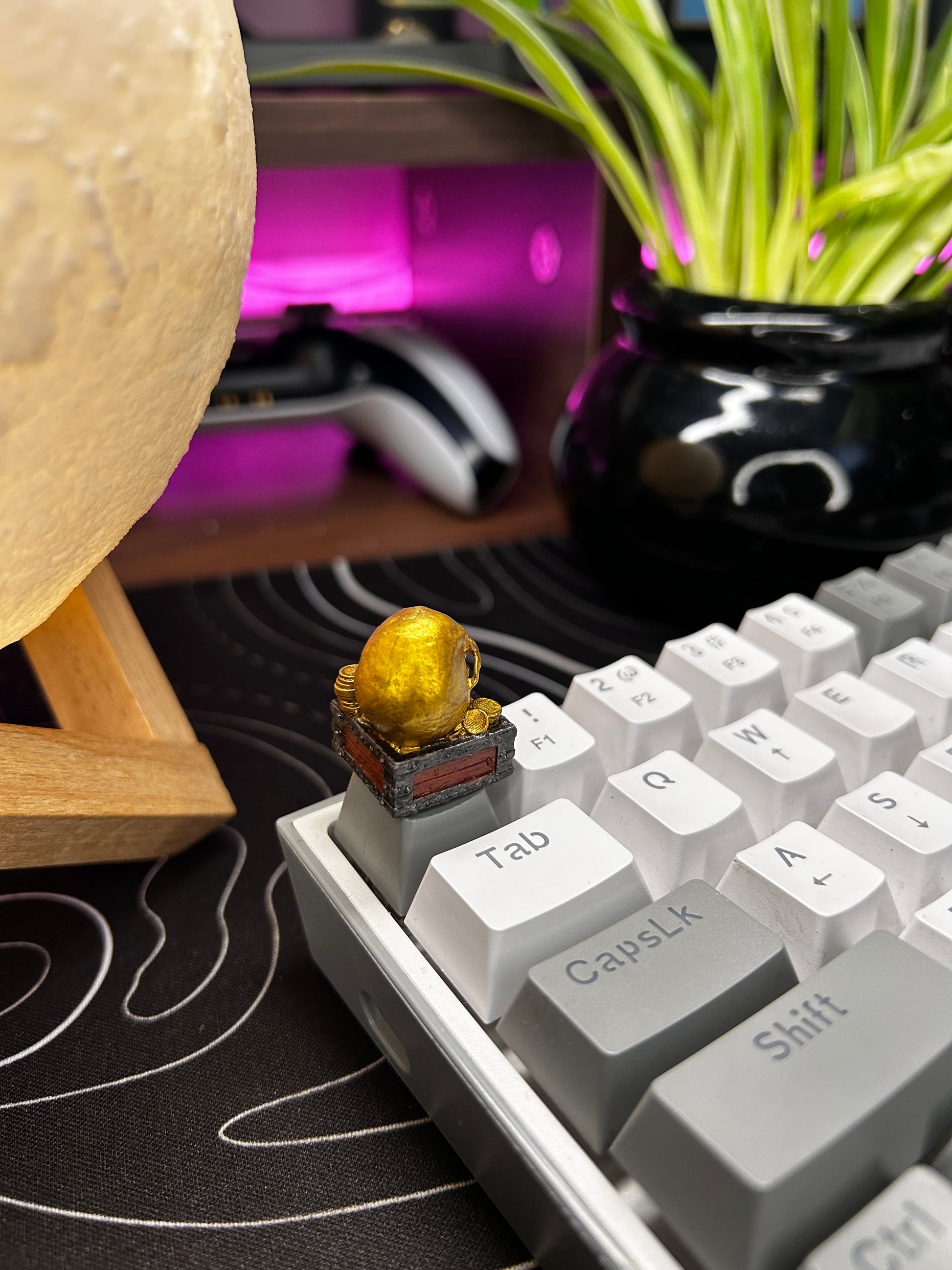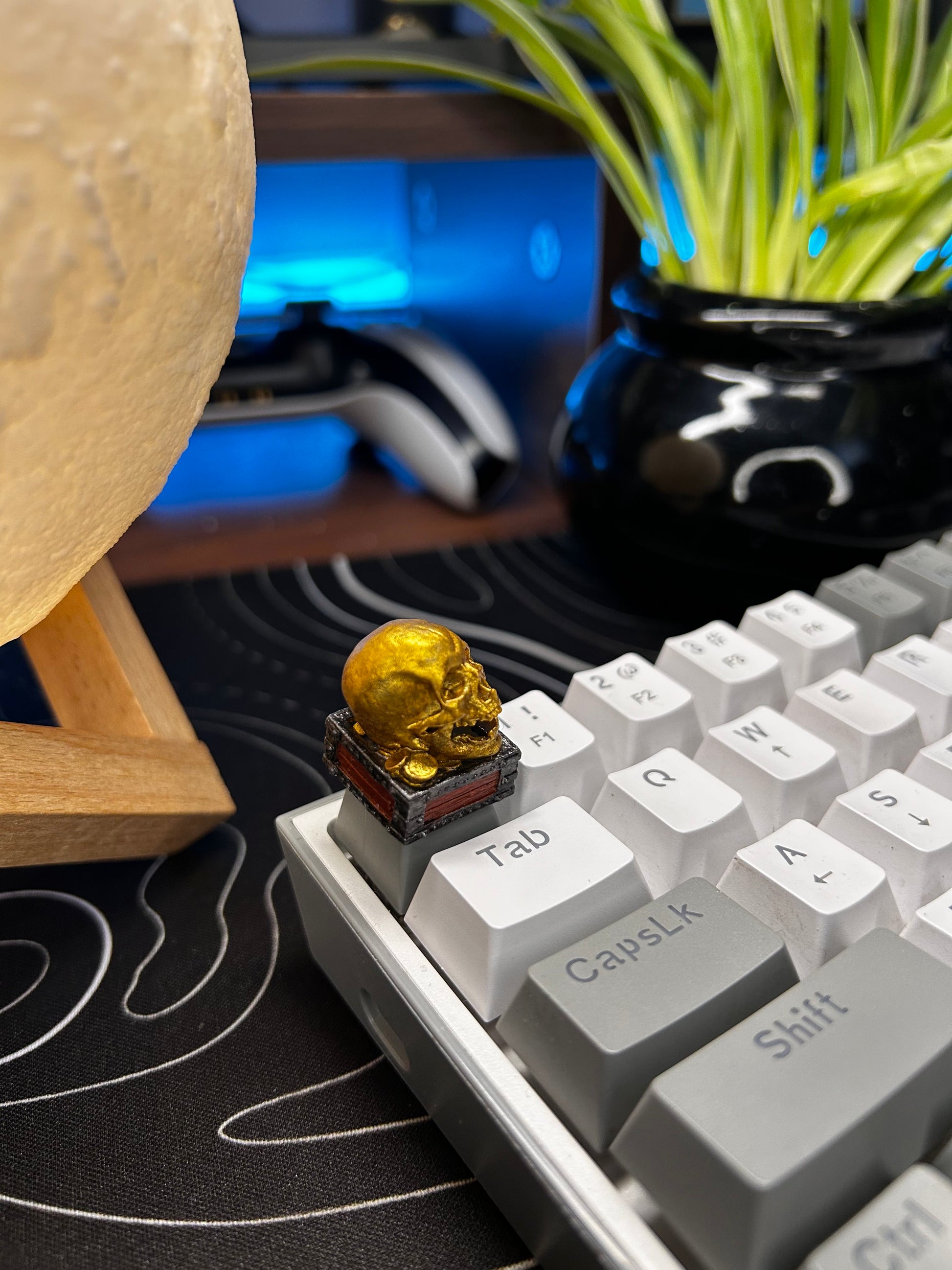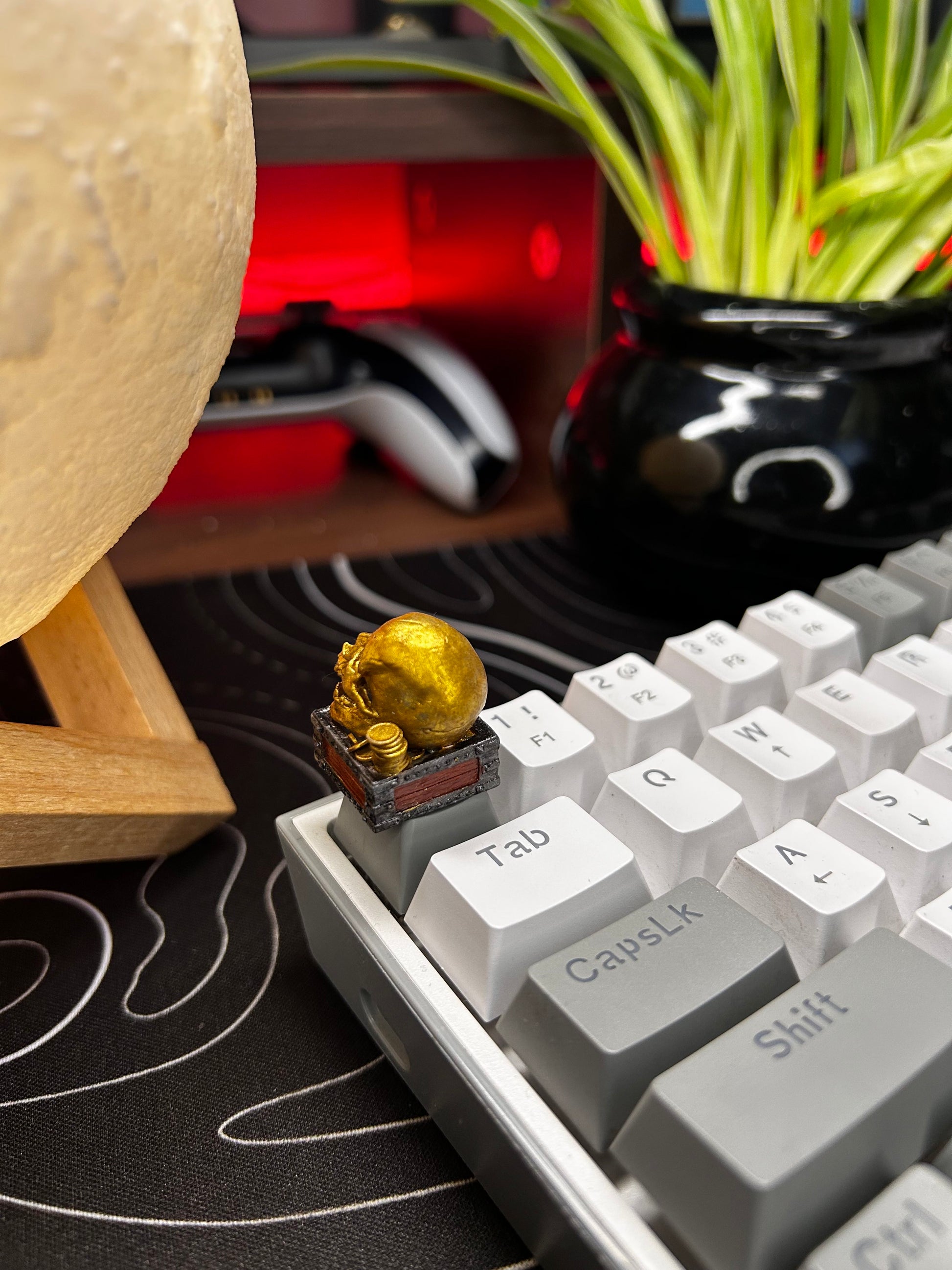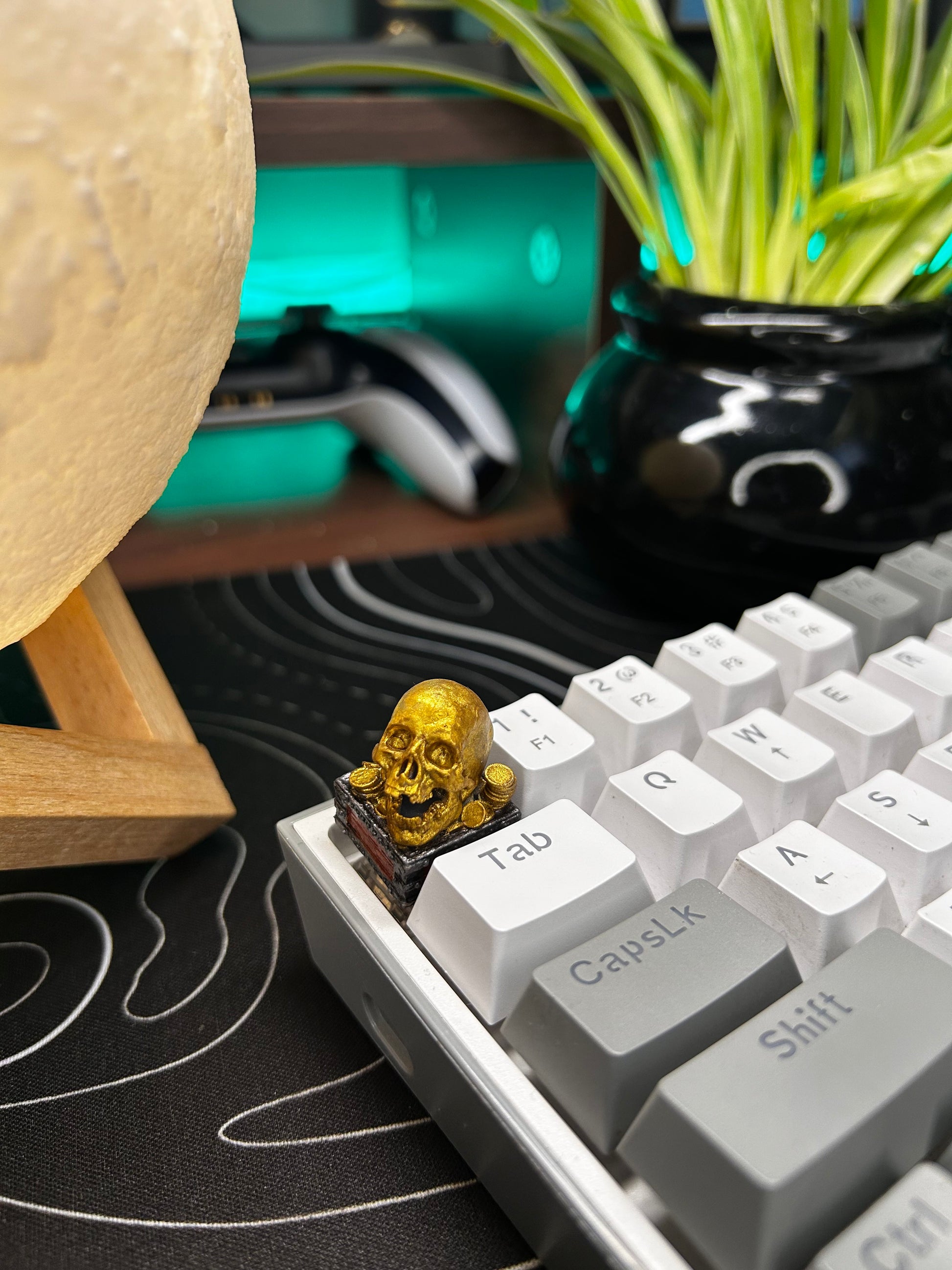 Do not be fooled by its shine, the gold is a lure, the skull a seal. This keycap was once part of a pirate king’s final plunder, sealed in a chest no mortal should’ve opened. The coins whisper. The skull watches. And those who type upon it often find their fate...rewritten.